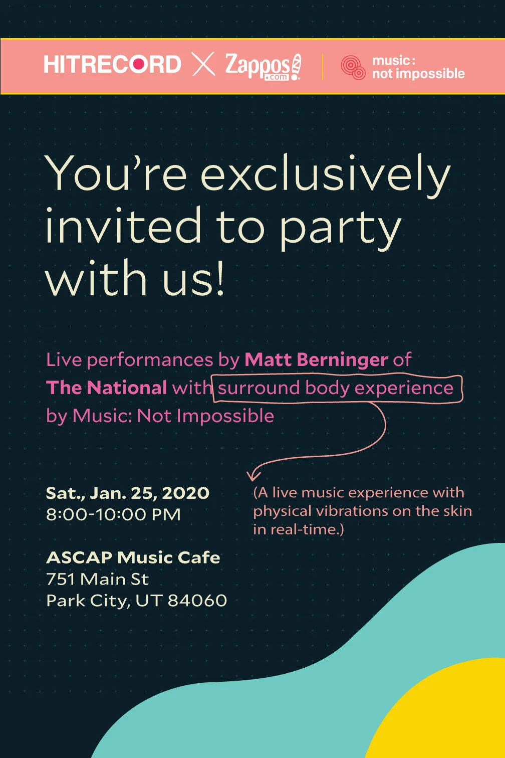 In conjunction with the digital premiere of the mini documentaries, we hosted a 3-day private event (#SundanceLiveLabs) for hundreds of guests where we facilitated a live creative collaboration, a special performance from Matt Berninger of The National, and a special demonstration from Music: Not Impossible that allows individuals with hearing impairments to experience live music through physical vibrations.